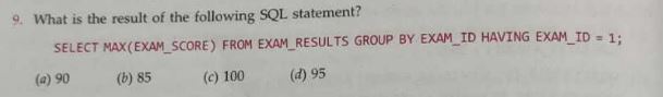 (c) SELECT AVG(EXAM_SCORE) FROM EXAM_RESULTS GROUP BY EXAM_ID HAVING EXAM_ID =1;
